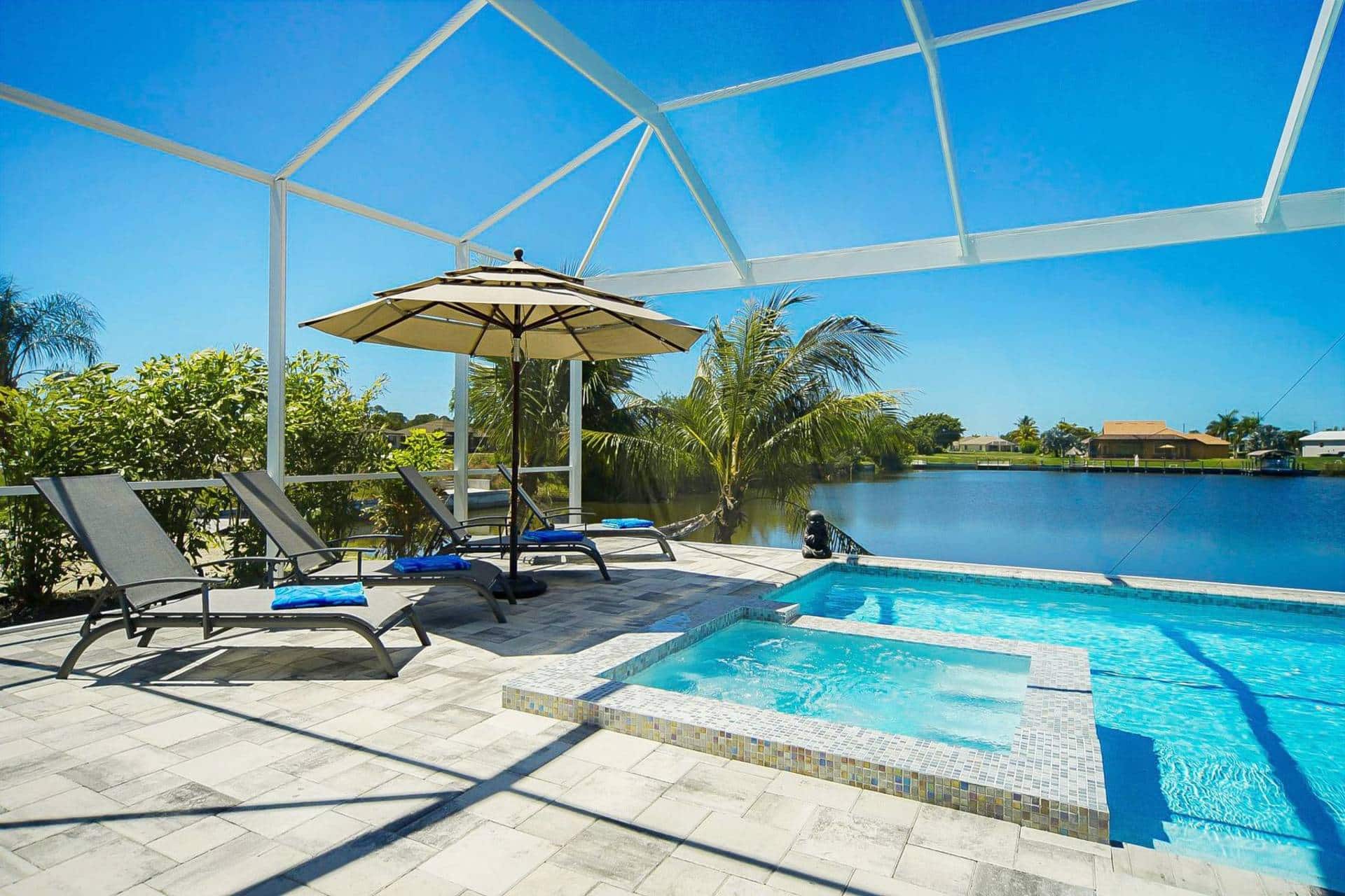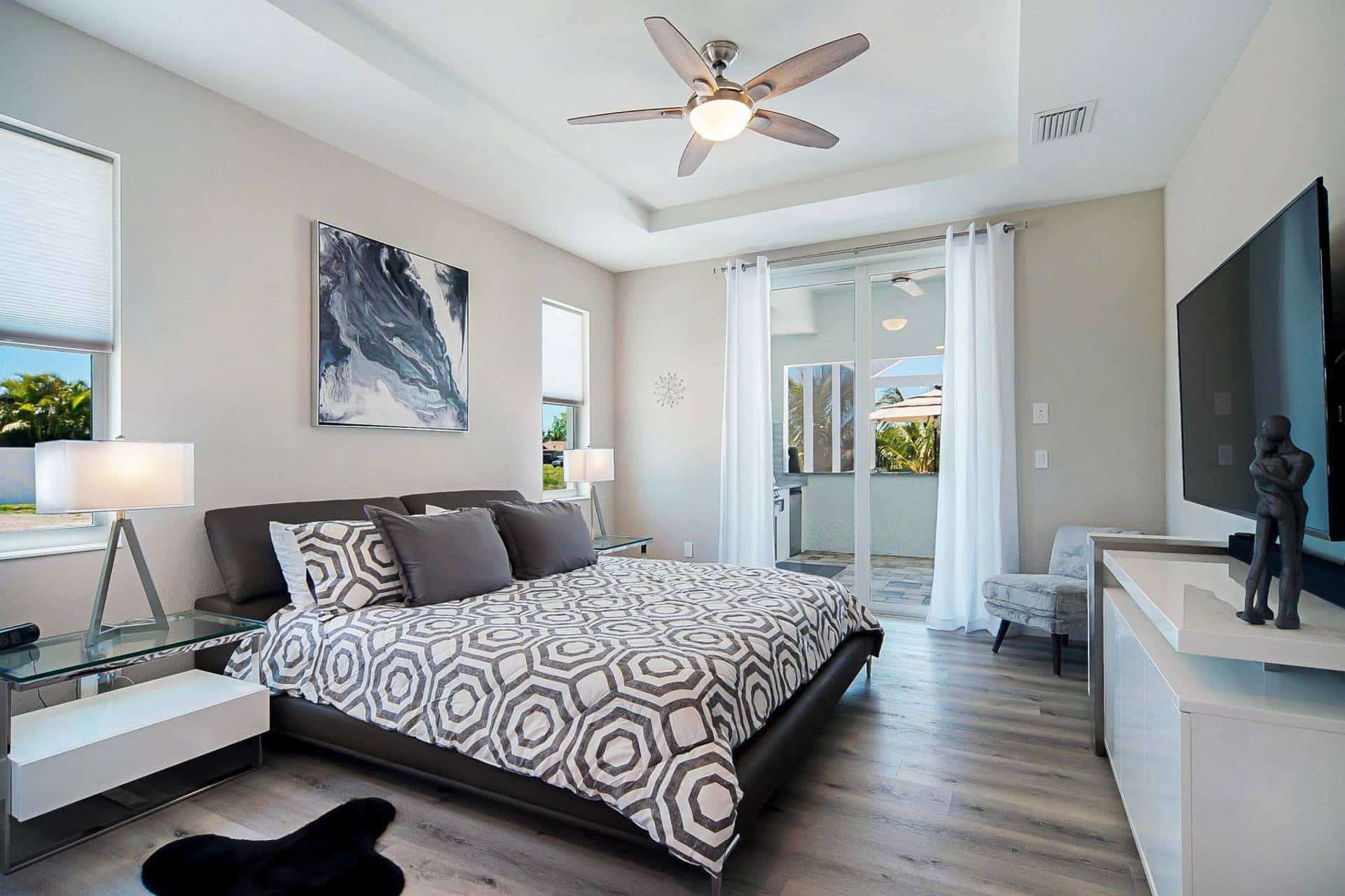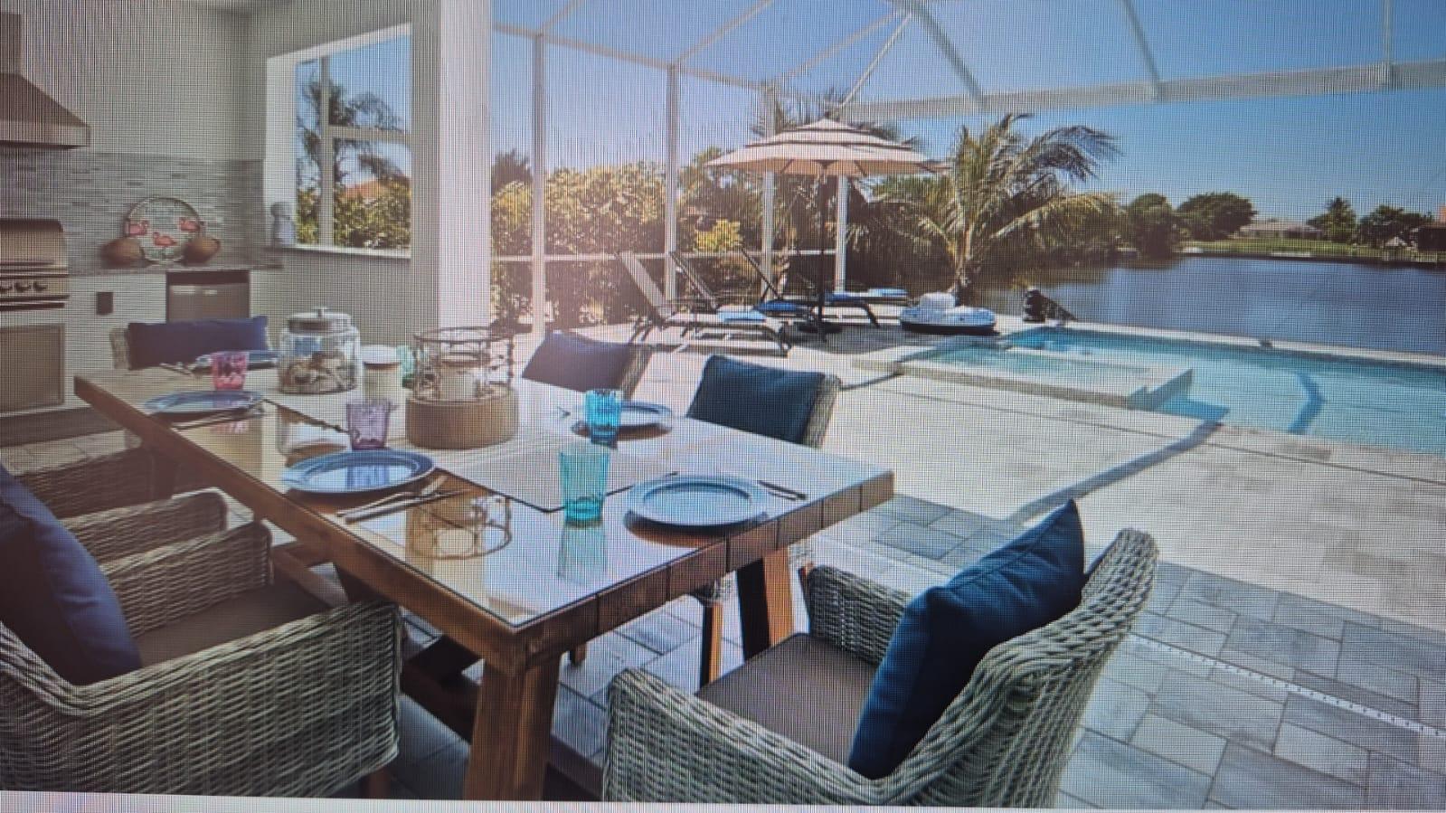This beautiful dream villa in Cape Coral was newly built and furnished in a classy, modern style in 2020. Every detail of this home was chosen with great care and love. This Villa is located on a basin with an incredible west-facing view. From your own private boat dock, you can easily reach the Gulf of Mexico. We are happy to assist you with renting a boat. Upon entering the villa, you are welcomed into the bright and spacious living area, which is connected to the open kitchen and dining room. On the front left, there is a cozy, beautifully furnished living room. You will also find a small sitting area with a desk, perfect for catching up on emails or enjoying a good book. To the left is the wonderful master suite. On the right side, behind the kitchen area, you will find the second guest bedroom and the guest bathroom. Facing the pool area is the junior suite with its own bathroom. The outdoor area is amazing, offering two separate covered lanai spaces. The smaller lanai adjoins the junior suite. The larger covered lanai, connected to the living area and the master bedroom, features a summer kitchen with an outdoor grill and a small bar. High Speed WLAN