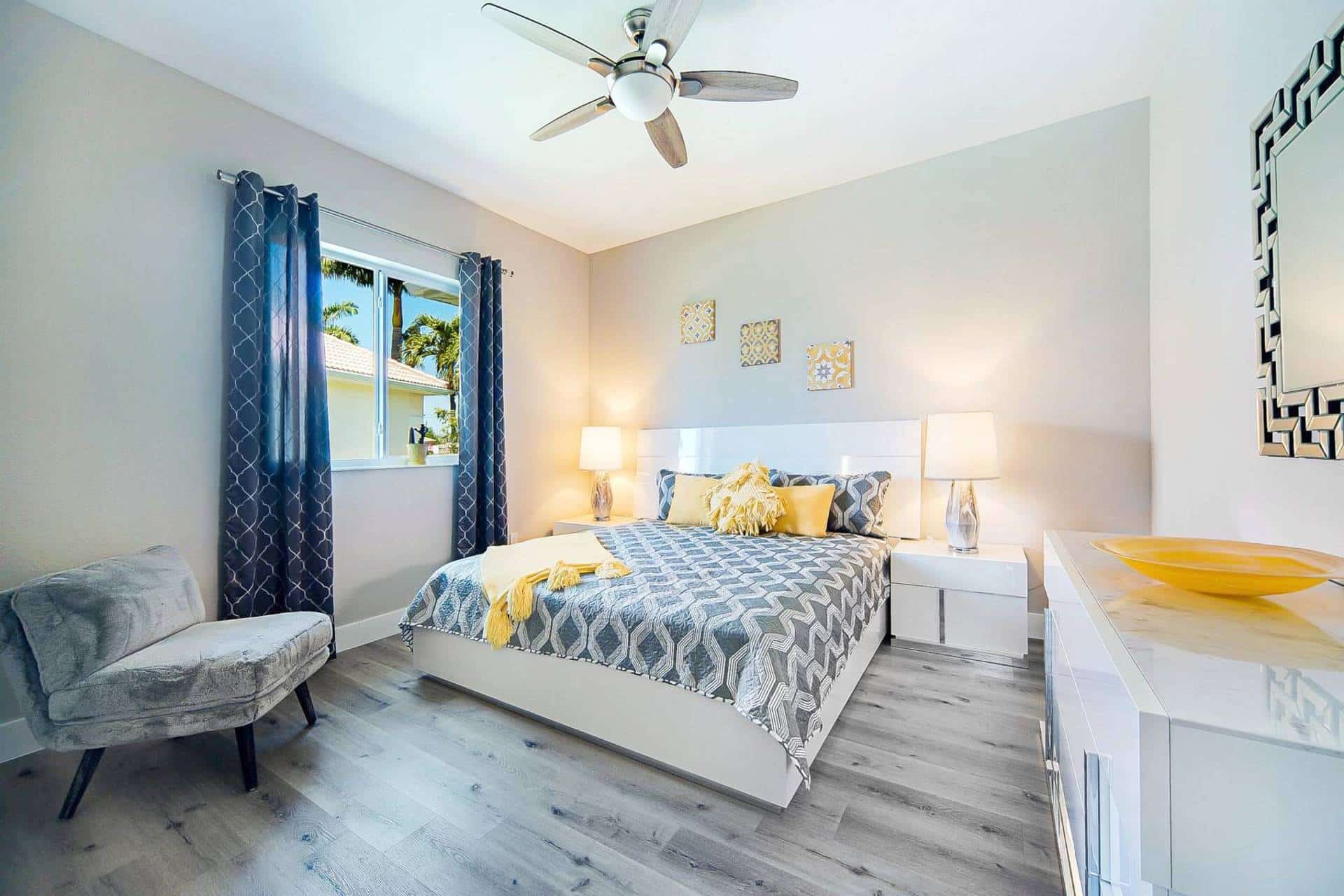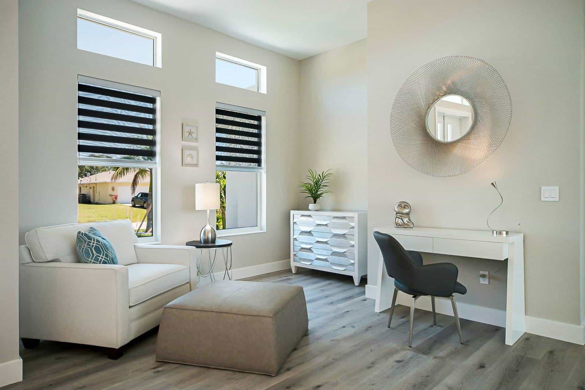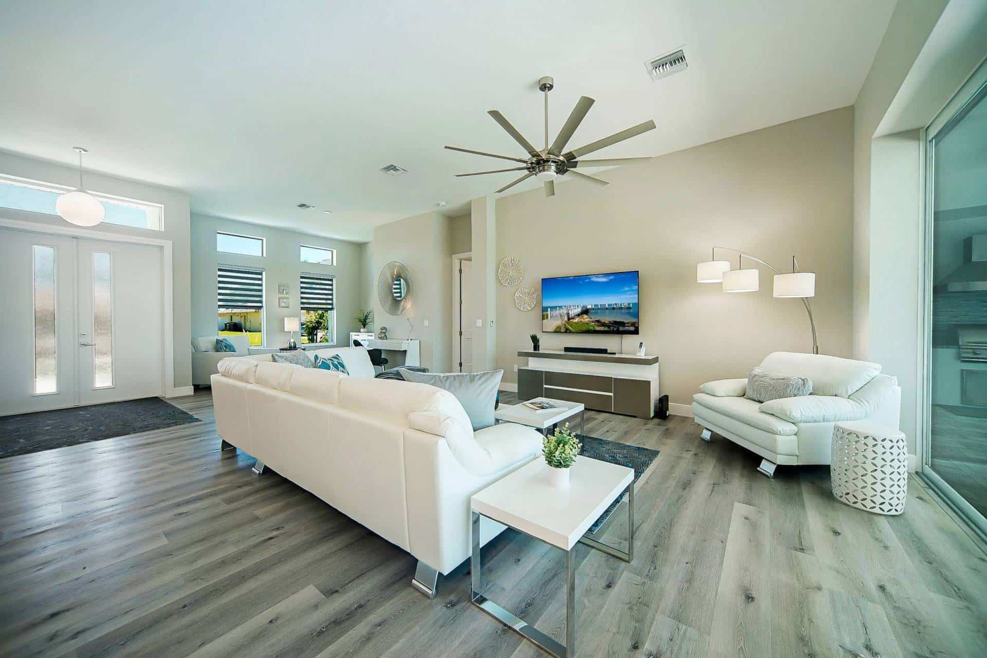 This beautiful dream villa in Cape Coral was newly built and furnished in a classy, modern style in 2020. Every detail of this home was chosen with great care and love. This Villa is located on a basin with an incredible west-facing view. From your own private boat dock, you can easily reach the Gulf of Mexico. We are happy to assist you with renting a boat. Upon entering the villa, you are welcomed into the bright and spacious living area, which is connected to the open kitchen and dining room. On the front left, there is a cozy, beautifully furnished living room. You will also find a small sitting area with a desk, perfect for catching up on emails or enjoying a good book. To the left is the wonderful master suite. On the right side, behind the kitchen area, you will find the second guest bedroom and the guest bathroom. Facing the pool area is the junior suite with its own bathroom. The outdoor area is amazing, offering two separate covered lanai spaces. The smaller lanai adjoins the junior suite. The larger covered lanai, connected to the living area and the master bedroom, features a summer kitchen with an outdoor grill and a small bar. High Speed WLAN