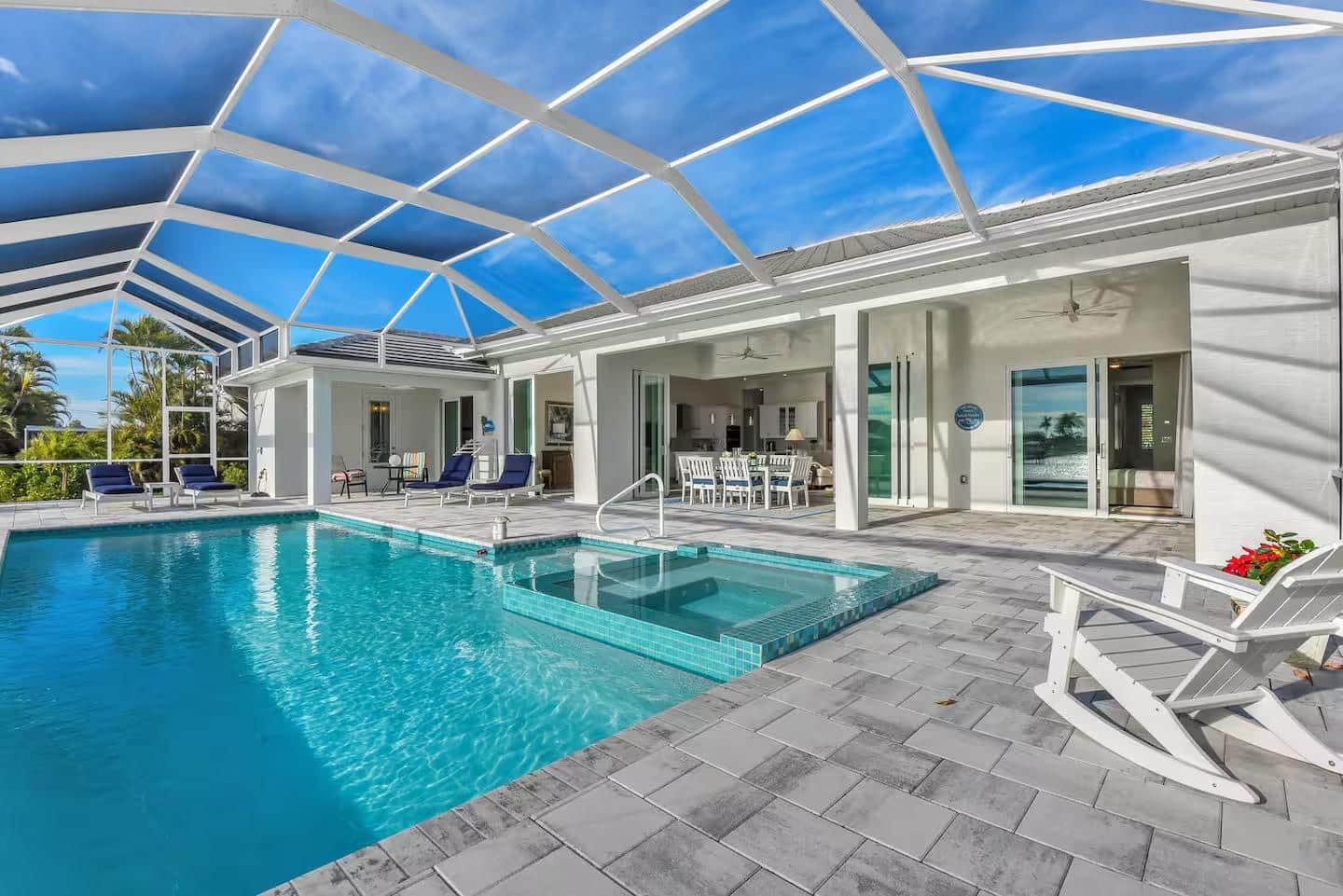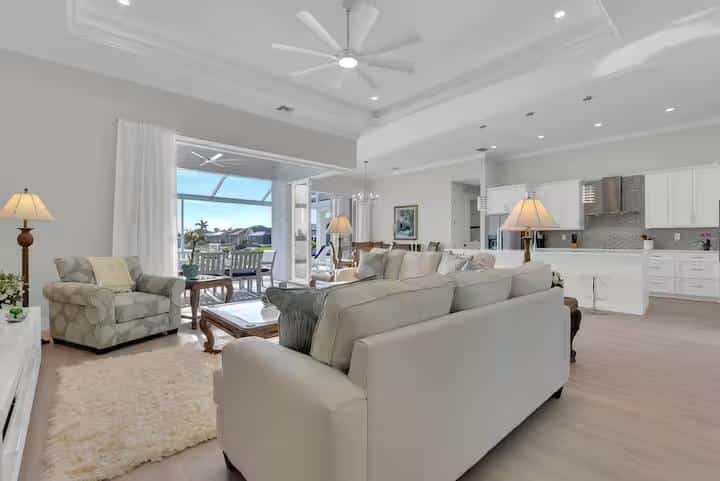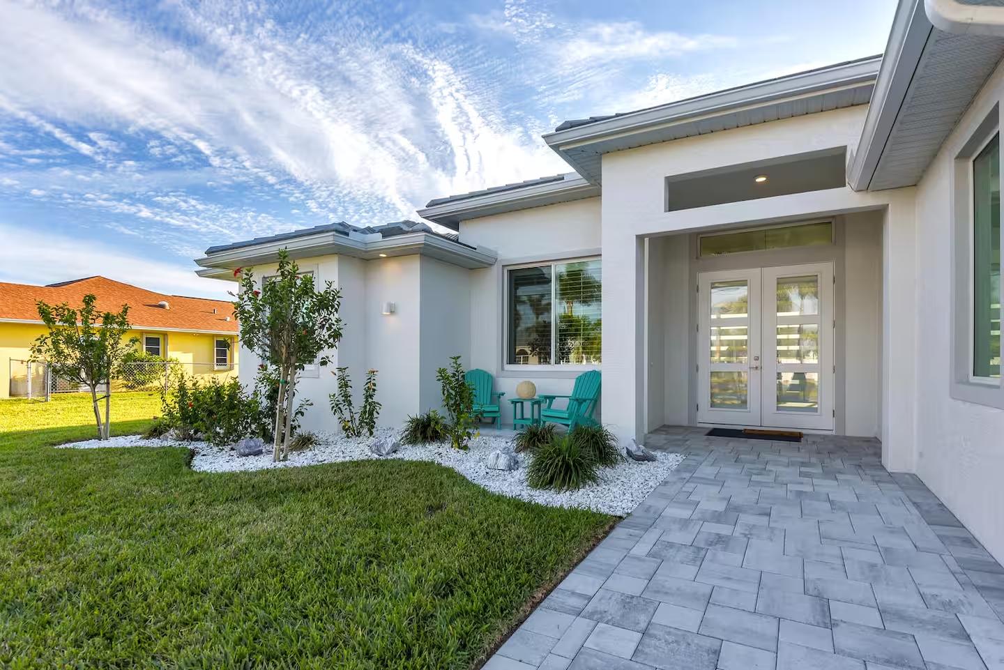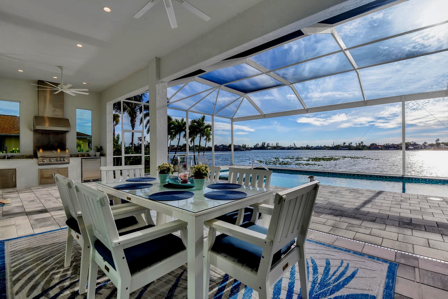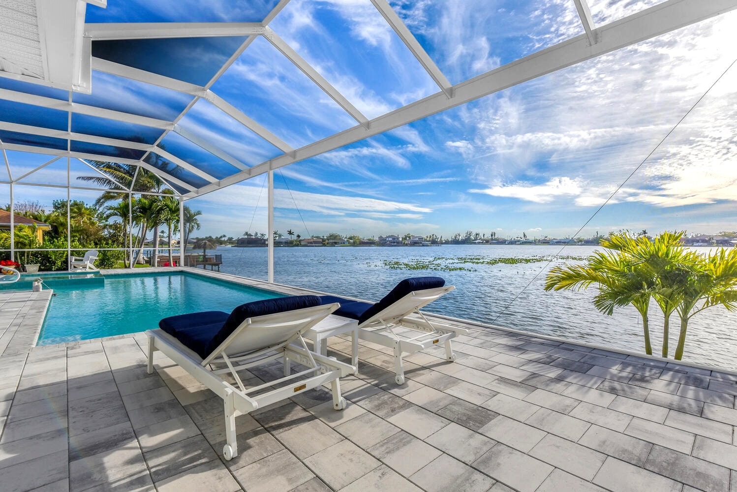 Located in one of the coolest waterfront areas in Cape Coral, you will find this Lake Villa . From the moment you step inside, the stunning water view will blow you away. Large sliding glass doors open right onto the pool deck, which features a huge pool and a Jacuzzi. The heart of the home is the spacious, modern living area, complete with a dining room and a stylish American kitchen. Everything is top-quality and beautifully decorated. You will find big TVs in every bedroom, also in the living room. The master bedroom is on the left side of the house and comes with an en-suite bathroom. Master bedroom also has direct access to the pool area. On the right side of the house, there are two guest bedrooms, each with its own bathroom. One of the guest rooms also has direct access to the pool deck, and its bathroom can be reached from the pool area as well. There is a large, convenient laundry room with a washer, dryer, and storage space right off the kitchen. You can also easily get to the living area through the garage. One really handy feature: The living area and bedrooms each have their own air conditioning. The pool deck is amazing, with sun loungers, a dining table, chairs, and even an outdoor shower. The large summer kitchen is perfect for hosting unforgettable BBQs. It is equipped with a high-end gas grill, a range hood, a sink, and a beverage fridge.  The amazing sunsets over the lake which connects to seven other lakes will surely spark your imagination. Welcome .