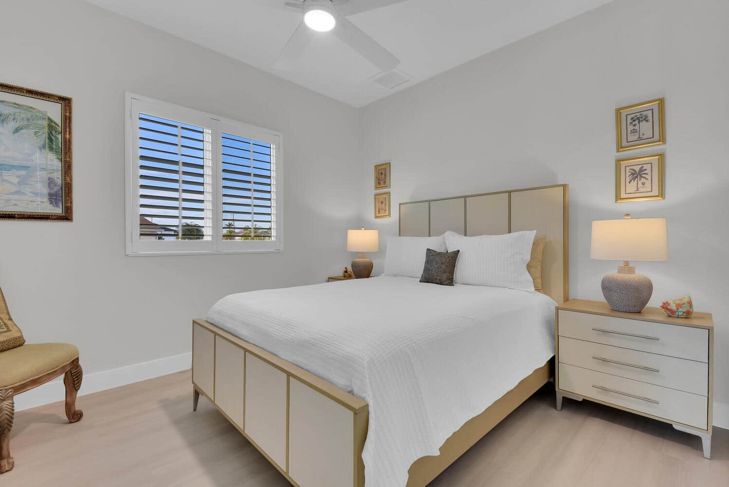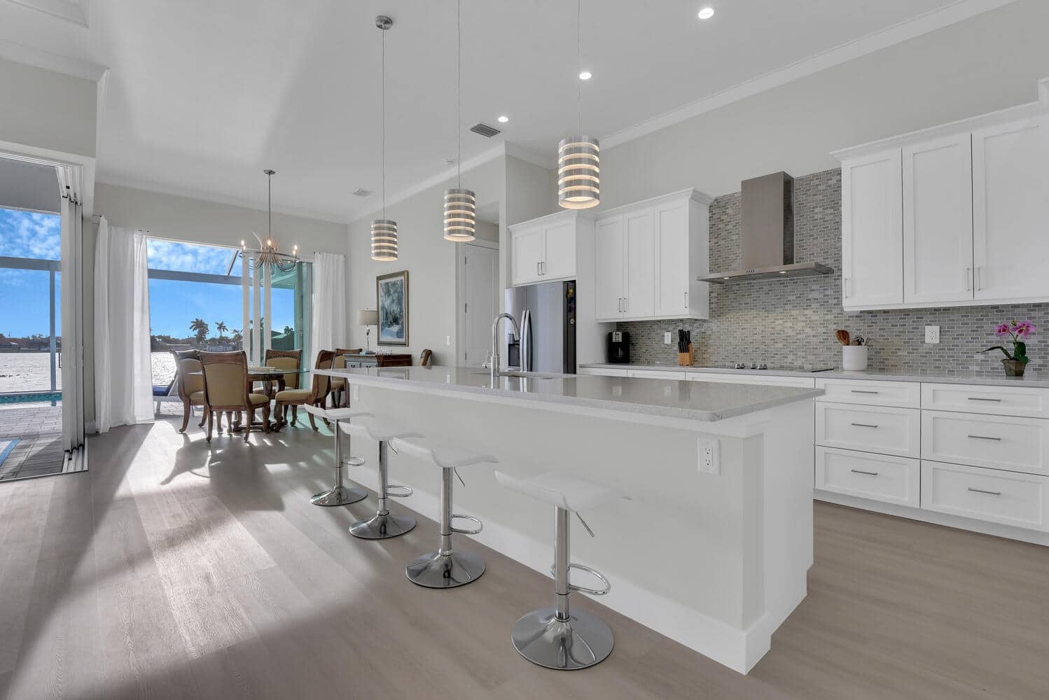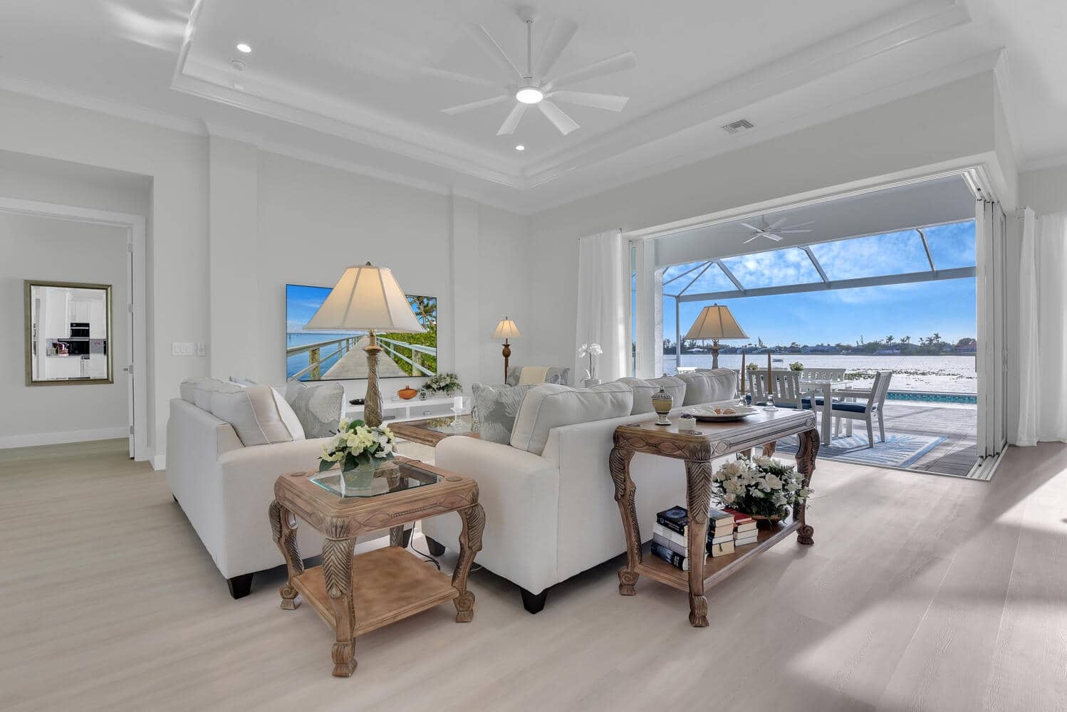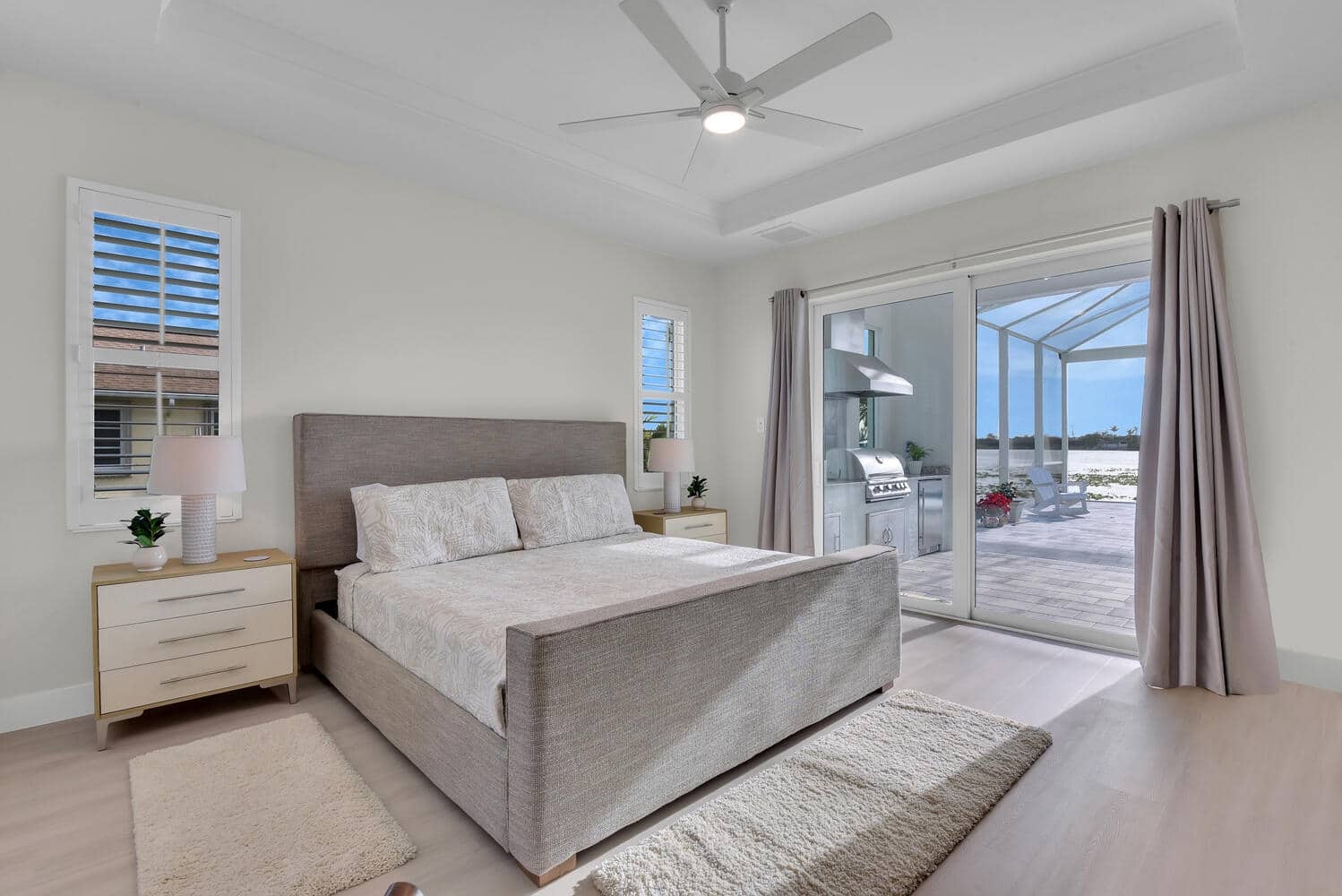 Located in one of the coolest waterfront areas in Cape Coral, you will find this Lake Villa . From the moment you step inside, the stunning water view will blow you away. Large sliding glass doors open right onto the pool deck, which features a huge pool and a Jacuzzi. The heart of the home is the spacious, modern living area, complete with a dining room and a stylish American kitchen. Everything is top-quality and beautifully decorated. You will find big TVs in every bedroom, also in the living room. The master bedroom is on the left side of the house and comes with an en-suite bathroom. Master bedroom also has direct access to the pool area. On the right side of the house, there are two guest bedrooms, each with its own bathroom. One of the guest rooms also has direct access to the pool deck, and its bathroom can be reached from the pool area as well. There is a large, convenient laundry room with a washer, dryer, and storage space right off the kitchen. You can also easily get to the living area through the garage. One really handy feature: The living area and bedrooms each have their own air conditioning. The pool deck is amazing, with sun loungers, a dining table, chairs, and even an outdoor shower. The large summer kitchen is perfect for hosting unforgettable BBQs. It is equipped with a high-end gas grill, a range hood, a sink, and a beverage fridge.  The amazing sunsets over the lake which connects to seven other lakes will surely spark your imagination. Welcome .