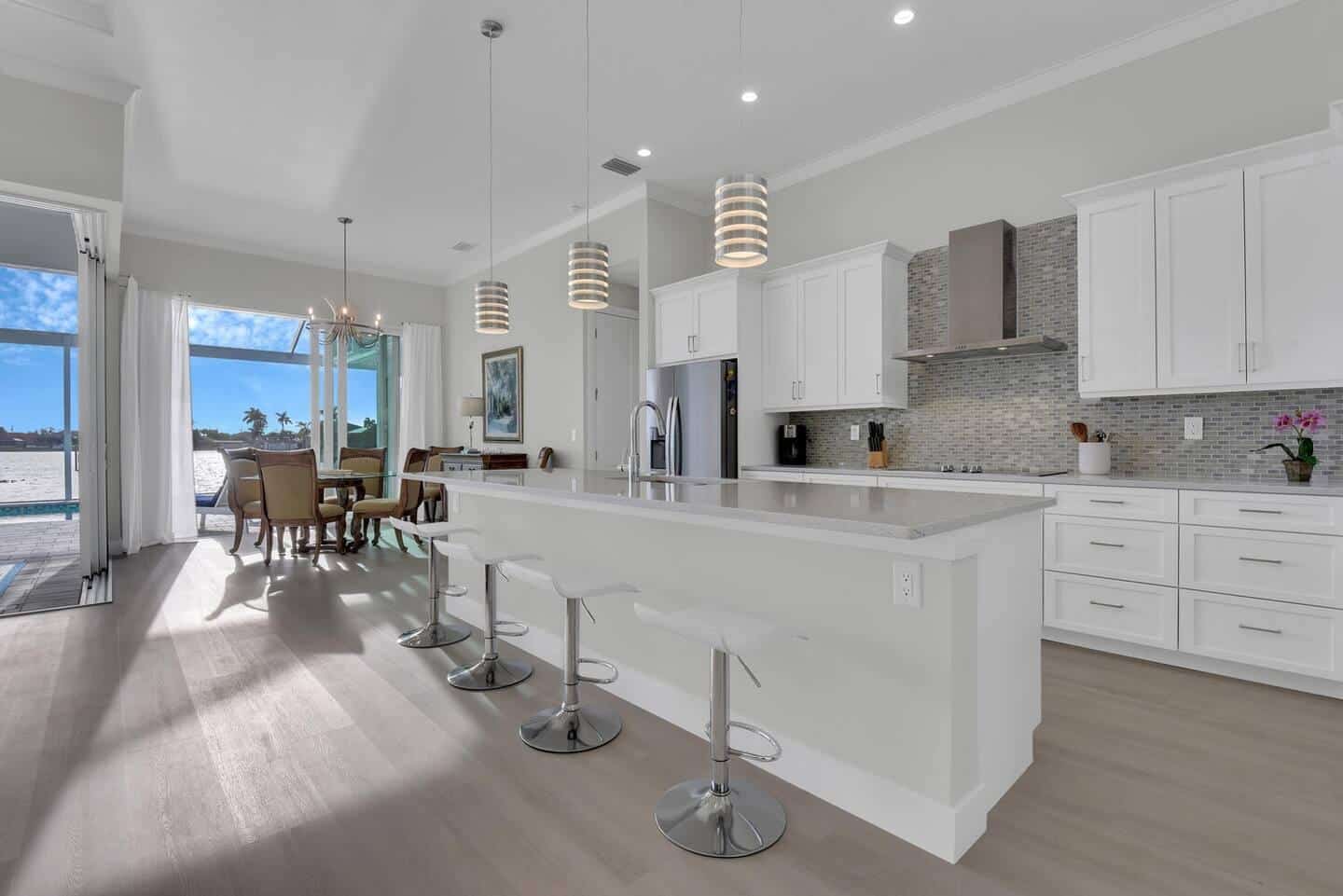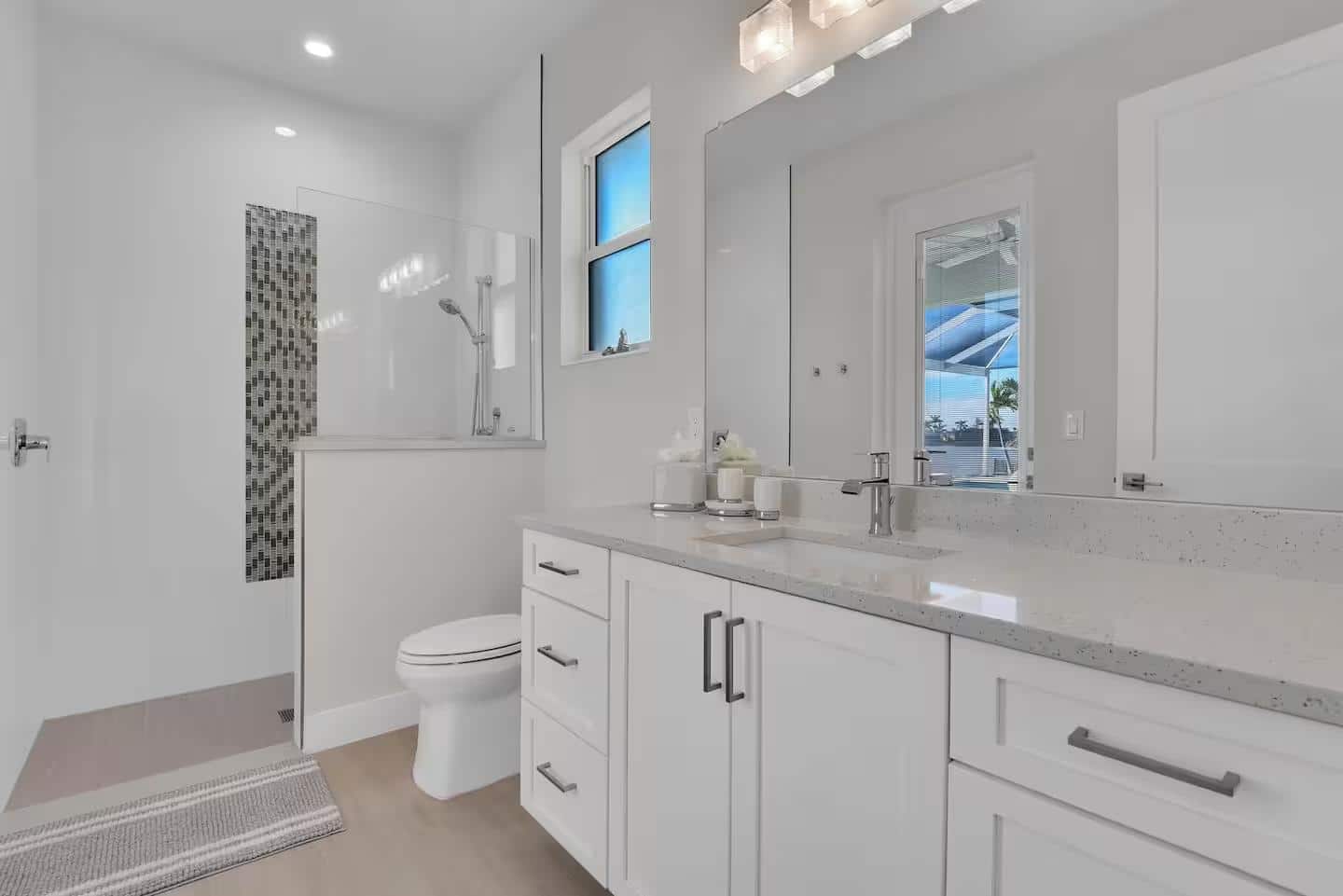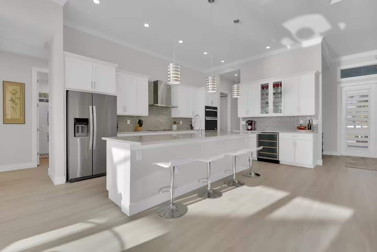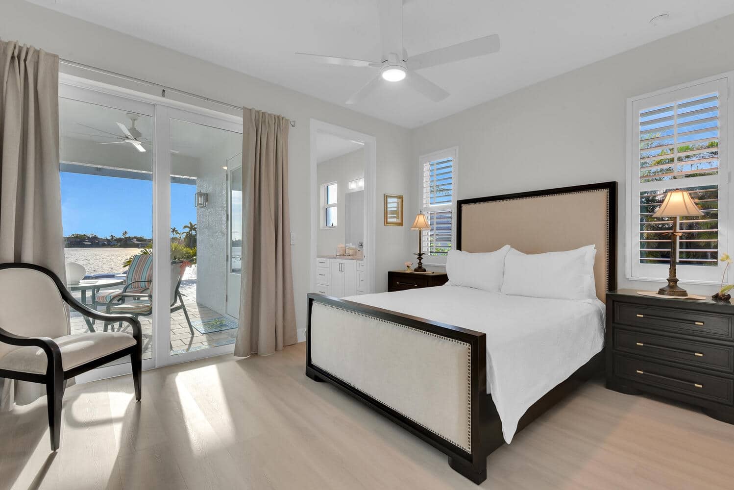 Located in one of the coolest waterfront areas in Cape Coral, you will find this Lake Villa . From the moment you step inside, the stunning water view will blow you away. Large sliding glass doors open right onto the pool deck, which features a huge pool and a Jacuzzi. The heart of the home is the spacious, modern living area, complete with a dining room and a stylish American kitchen. Everything is top-quality and beautifully decorated. You will find big TVs in every bedroom, also in the living room. The master bedroom is on the left side of the house and comes with an en-suite bathroom. Master bedroom also has direct access to the pool area. On the right side of the house, there are two guest bedrooms, each with its own bathroom. One of the guest rooms also has direct access to the pool deck, and its bathroom can be reached from the pool area as well. There is a large, convenient laundry room with a washer, dryer, and storage space right off the kitchen. You can also easily get to the living area through the garage. One really handy feature: The living area and bedrooms each have their own air conditioning. The pool deck is amazing, with sun loungers, a dining table, chairs, and even an outdoor shower. The large summer kitchen is perfect for hosting unforgettable BBQs. It is equipped with a high-end gas grill, a range hood, a sink, and a beverage fridge.  The amazing sunsets over the lake which connects to seven other lakes will surely spark your imagination. Welcome .